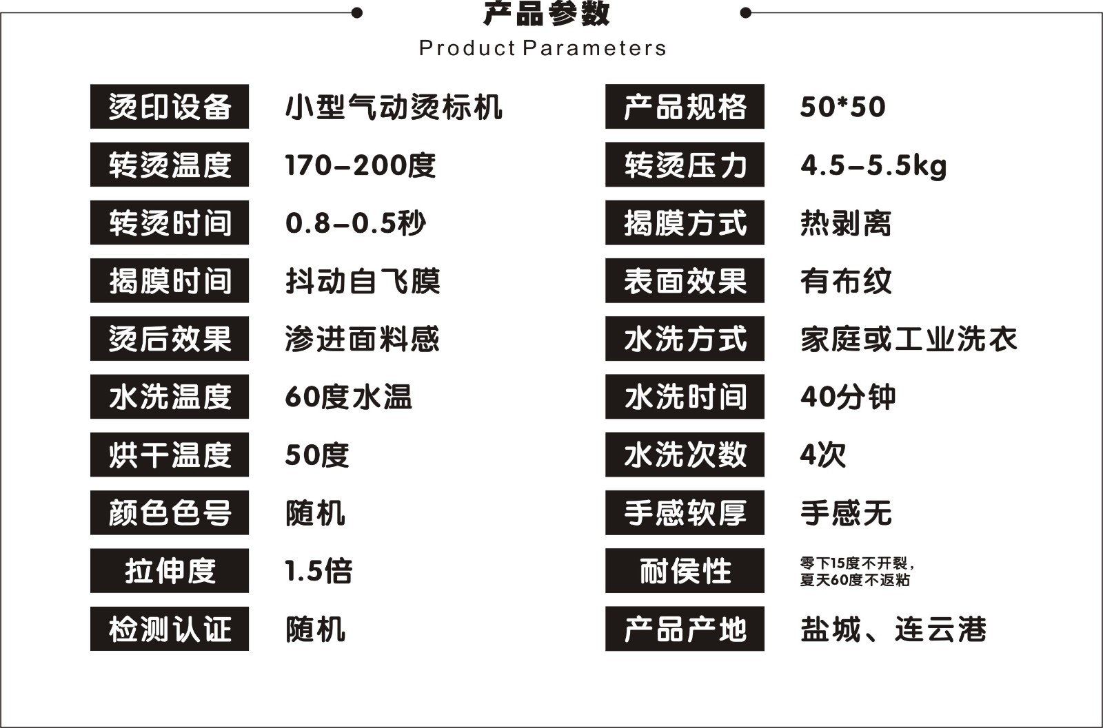 | 熱轉印條件 | 溫度:130-160度,時間:6-12秒/次,壓力:0.24 kgf/cm^2以上 |