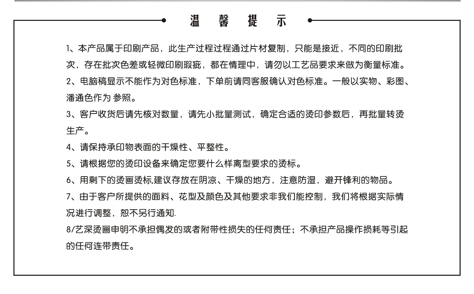 | 熱轉(zhuǎn)印條件 | 溫度:135-140度,時間:6-12秒/次,壓力:0.24 kgf/cm^2以上,正反壓燙效果好 |